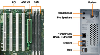 Fem kortpladser, tre diskpladser samt plads til 1,5 GB RAM sikrer udvidelsesmulighederne i Power Mac G4. Disse pladser giver mulighed for at forbedre Power Mac G4s ydeevne, så computeren kan klare krævende opgaver som digital videoredigering og DVD-produktion. Den første plads - også kaldet AGP 4X-grafikpladsen - er optimeret til et grafikkort. Computeren leveres med et NVIDIA GeForce2 MX-grafikkort med 32 MB SDRAM (733 MHz og 867 MHz Power Mac G4-modellerne), eller et NVIDIA GeForce2 MX TwinView-grafikkort, der kan arbejde med to skærme, med 64 MB SDRAM (800 MHz Power Mac G4 med to processorer). De øvrige fire pladser er 64 bit 33 MHz PCI-pladser med forbedret ydeevne (den maksimale overførsel er 215 MB pr. sekund). Disse pladser kan bruges til specielle kort til lyd- og videofunktioner og specielle effekter samt til SCSI-kort eller ekstra grafikkort. ![]() Installer op til 1,5 GB RAM Hvis du arbejder med grafik eller 3D-modellering og -animation, skal du huske, at krævende programmer som FreeHand, Mathematica og LightWave 3D afvikles bedre med masser af hukommelse. Derfor er der tre RAM-pladser i den nye Power Mac G4, så den samlede kapacitet er 1,5 GB PC 133-standardhukommelse.