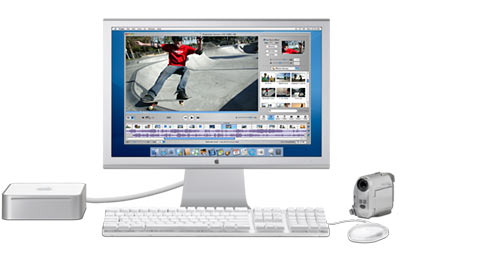 23" Apple Cinema HD DisplayRediger HD-film i iMovie i naturlige opløsning på 1920 x 1200 punkter på en smart og elegant skærm, som passer rigtig fint sammen med Mac minis anodiserede aluminiumskabinet. |