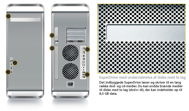 Lynhurtig. Indeni sikrer PowerPC G5-processorer med to kerner og en række avancerede teknologier en rasende ydeevne. En exceptionel computer fortjener selvfølgelig et exceptionelt kabinet. Power Mac G5 har et smukt og grundigt designet ydre med praktisk placering af porte og en side, som nemt kan åbnes.