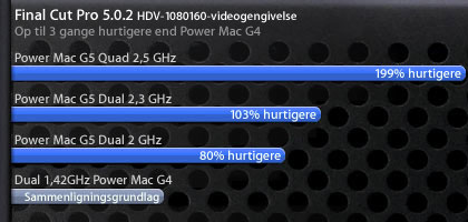 - Power Mac G5-systemer med to eller fire kerner pr. processor sætter fart på redigeringen og forbedrer produktioner med flere streams og flere kameraer i Final Cut Studio- med understøttelse af flere samtidige streams og effekter i realtid samt hurtigere videobehandling og -gengivelse.