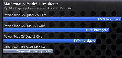 - Test udført af Apple i september 2005 med testmodeller af 2,5 GHz Power Mac G5 Quad-enheder; alle andre systemer var produktionsmodeller. Du kan se de komplette testresultater i denne teknologioversigt.