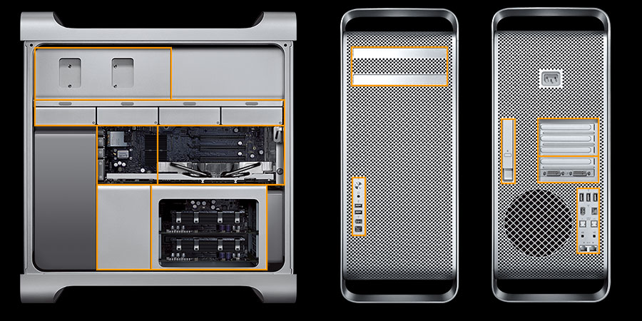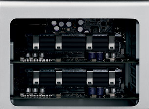 Med hele dens række af Intel Xeon-processorer introducerer Mac Pro en ny æra i arbejdsstationers ydeevne. Og takket være en design tour de force hæver Mac Pro også niveauet for brugervenlighed. Dens omdesignede kabinet giver bedre funktionalitet og lettere tilgængelighed. Den indeholder fire rum til harddiske og en ny kabelfri installeringsproces, hvor du ikke skal bekymre dig om stik og kabler. Og den nye PCI-ramme, der ikke kræver værktøj, forenkler installeringen og udskiftningen af udvidelseskort. Den nye grafikplads i dobbelt bredde betyder, at du ikke behøver at opgive en værdifuld udvidelsesplads. Otte FB-DIMM-pladser på to kort giver hurtig og enkel installering af hukommelse. Og du vil finde flere porte på forsiden, hvilket er praktisk - inkl. en FireWire 800- og en ekstra USB 2.0-port.