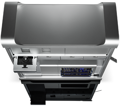 Med rimelig plads til fremtidig vækst indeholder det omdesignede kabinet i Mac Pro en PCI Express-grafikplads i dobbelt bredde. Installer et tilgængeligt grafikkort, og du kan stadig bruge en eller alle de tre resterende PCI Express-udvidelsespladser.