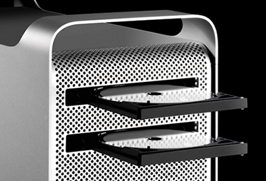 Alle Mac Pro-modeller leveres med et 16x SuperDrive, men der er en ekstra plads, så du kan udstyre Mac Pro med et par SuperDrives. Det er noget, der giver øget produktivitet: Med to 16x SuperDrives kan du læse fra det ene drev og skrive til det andet på samme tid. Læse fra begge drev. Eller endda skrive til begge.