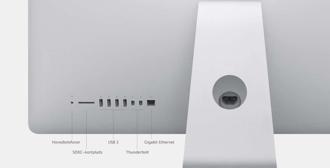 Den lille ultrahurtige og ultrafleksible Thunderbolt-port sikrer hidtil usete overførselshastigheder og utroligt fleksible udvidelsesmuligheder. Tilslut ydre enheder med stor ydeevne, f.eks. eksterne diske, kameraer, enheder til lyd- og videooptagelse – endda Mini DisplayPort-skærme for at få et større skærmområde. Alle iMac-modeller inkluderer to Thunderbolt-porte, så du kan opstille det ultimative skrivebord, der kan alt.