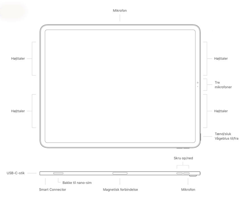 Skærmen på 12,9" iPad Pro har afrundede hjørner, som følger designets elegante kurver. Hjørnerne ligger inden for et format svarende til et almindeligt rektangel. Målt som et almindeligt rektangel er skærmen 12,9" diagonalt (det faktiske visningsområde er mindre).