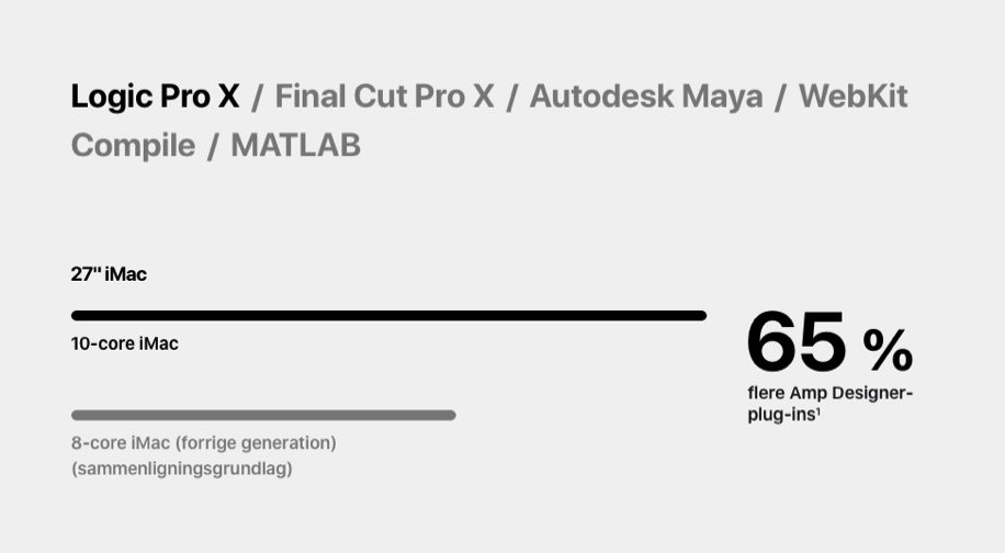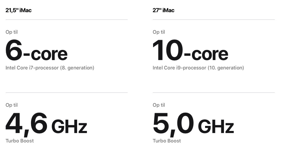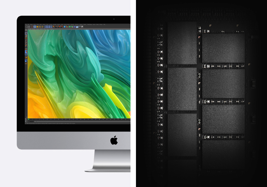 Fra hurtig til helt vildt hurtig. iMac og powerfulde processorer går hånd i hånd. Med op til en 6-core Intel Core i7-processor har 21,5" iMac al den power, du har brug for, når du arbejder i Photoshop, redigerer videoer eller laver musik. Og 27" iMac fås med op til en 10-core Intel Core i9-processor, så krævende opgaver som produktioner med masser af lydspor eller kompilering og test af kode går som en leg.