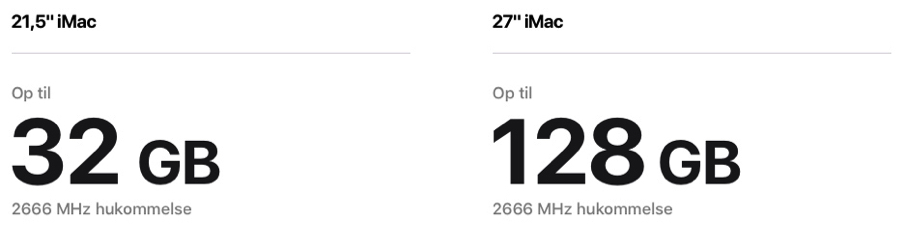 Mere hukommelse. Til seriøst store projekter. 21,5" iMac kan konfigureres til imponerende 32 GB hukommelse. Og 27" iMac kan nu konfigureres til 128 GB – dobbelt så stor kapacitet som den forrige generation – så du kan klare selv de mest komplekse og krævende arbejdsgange op til dobbelt så hurtigt.