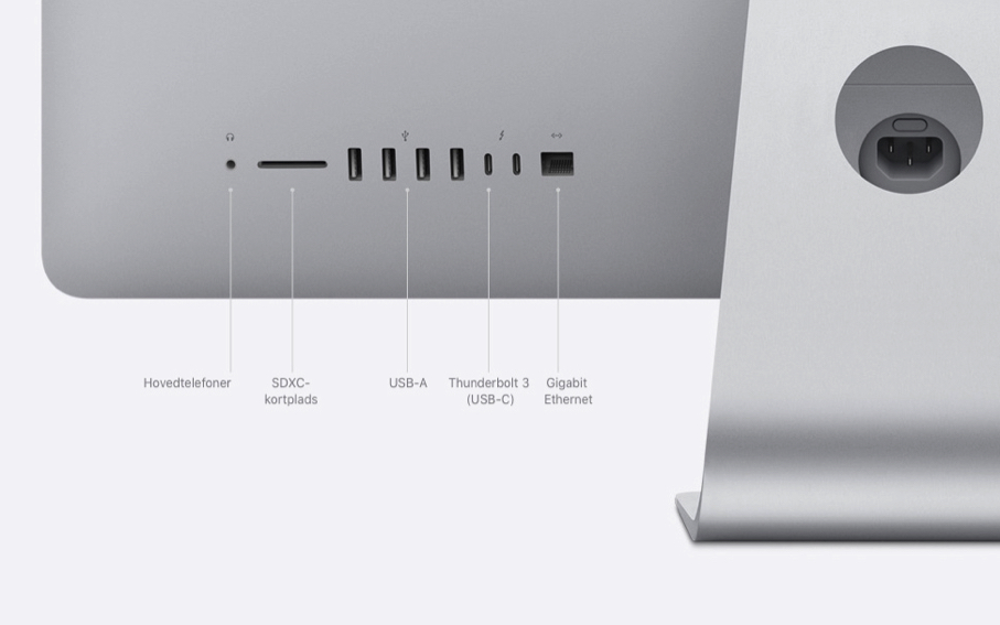 Et væld af porte. Til alt muligt fantastisk. Enhver iMac er udstyret med to superhurtige Thunderbolt 3-porte (USB‑C) og fire USB‑A-porte, så du får masser af højtydende muligheder for tilslutning af eksterne drev, kameraer, skærme m.m. Alle iMac-modeller har en 1 Gb Ethernet-port, og du kan nu konfigurere 27" iMac med 10 Gb Ethernet, så du får op til 10 gange hurtigere hastighed end den forrige generation. Ultrahurtig Wi‑Fi og Bluetooth er standard på iMac, og 27” modellen har Bluetooth 5.0, så du får øjeblikkelig adgang til dine trådløse enheder og alt dit yndlingsindhold.